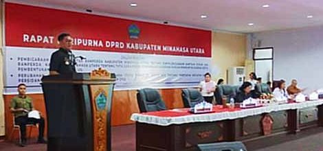 Paripurna dilanjutkan dengan mendengarkan Penjelasan Kepala Daerah terhadap dua Ranperda. Bupati Minut Joune J.E Ganda SE MAP MM MSi dalam penjelasannya menguraikan pentingnya dua Ranperda tersebut. “Pemberian bantuan hukum oleh pemerintah kepada masyarakat merupakan suatu bentuk upaya memastikan masyarakat khususnya masyarakat yang miskin yang ada di daerah dapat menikmati kedudukan yang sama di mata hukum. Masyarakat miskin di Kabupaten Minahasa Utara yang berhadapan dengan masalah atau pelanggaran hukum, baik perkara hukum perdata maupun pidana, maupun tata usaha Negara, perlu mendapatkan pendampingan hukum yang tentunya berdasarkan peraturan perundang-undangan dalam menyelenggarakan bantuan hukum. Untuk itu Pemerintah Daerah Kabupaten Minahasa Utara di pandang perlu segera membentuk peraturan daerah tentang penyelenggaraan bantuan hukum bagi masyarakat miskin. Dengan adanya payung hukum yang mendasari pemberian bantuan hukum bagi masyarakat miskin di Kabupaten Minahasa Utara, dapat memberikan kepastian hukum serta mewujudkan keadilan yang merata bagi masyarakat yang ada di Kabupaten Minahasa Utara,” urainya.