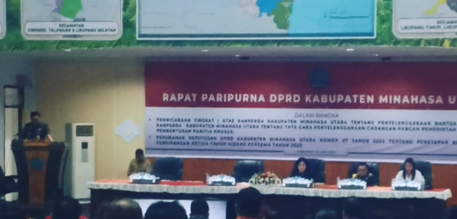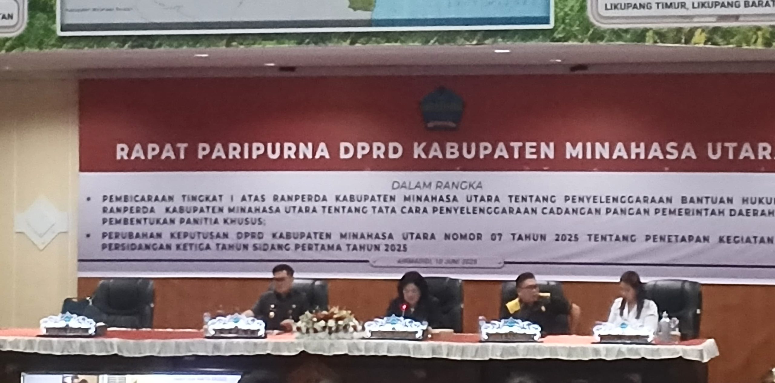 Trendingmanado.com— DPRD Kabupaten Minahasa Utara menggelar Rapat Paripurna dengan agenda Pembicaraan Tingkat I Atas Ranperda Kabupaten Minahasa Utara tentang Penyelenggaraan Bantuan Hukum dan Ranperda Kabupaten Minahasa Utara tentang Tata Cara Penyelenggaraan Cadangan Pangan Pemerintah Daerah Serta Pembentukan Panitia Khusus. Selain itu, paripurna juga digelar dengan agenda Perubahan Keputusan DPRD Kabupaten Minahasa Utara Nomor 07 Tahun 2024 tentang Penetapan Kegiatan Masa Persidangan Ketiga Tahun Sidang Pertama Tahun 2025.