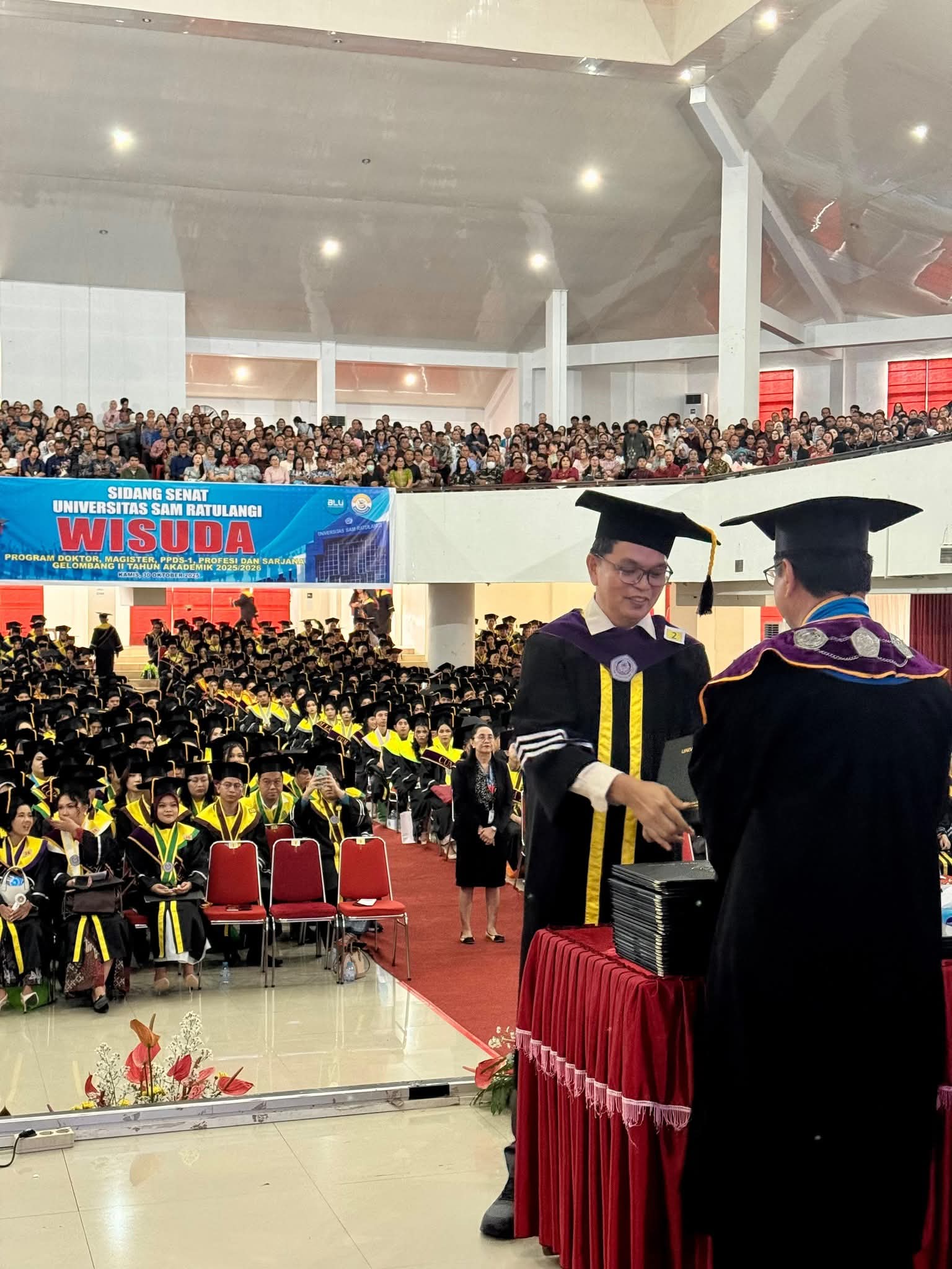 Unsrat menggelar Wisuda Periode II Tahun Akademik 2025/2026, yang dihadiri Rektor Unsrat Prof. Dr. Ir. Oktovian B.A. Sompie M.Eng. IPU. ASEAN Eng, dan Gubernur Sulut Mayjen TNI (Purn) Yulius Selvanus SE yang diwakili oleh Kaban Kesbangpol Daerah Sulawesi Utara Johny A. Suak SE, M.Si.