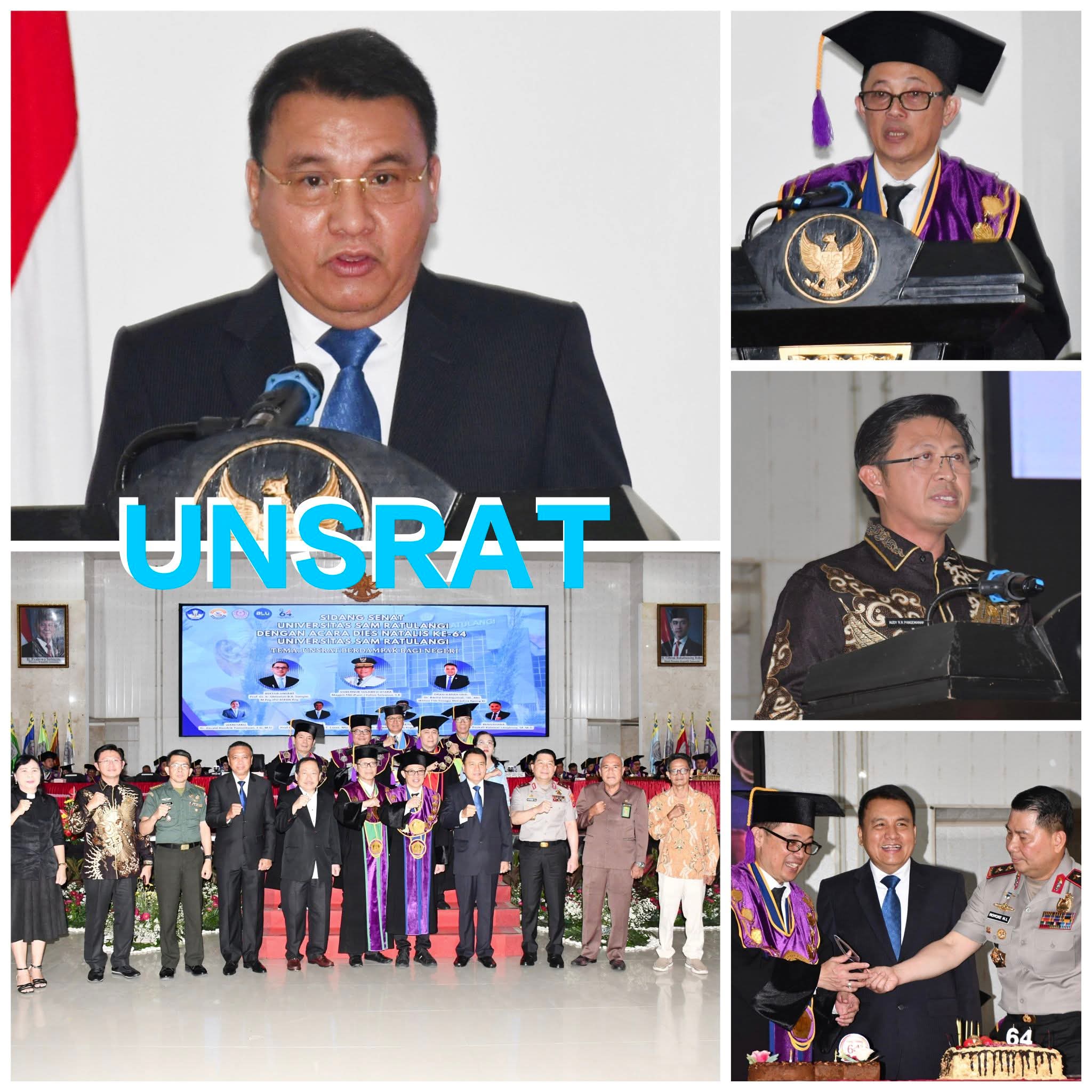 Gubernur Sulawesi Utara yang diwakili oleh Plt. Kepala Badan Pengembangan Sumber Daya Manusia Provinsi Sulut Dr. Drs. Audy RR Pangemanan dalam sambutannya mengatakan, di usia ke – 64 ini, Unsrat diharapkan terus bertransformasi menjadi universitas yang adaptif terhadap perubahan zaman, tanpa kehilangan jati diri sebagai lembaga pendidikan yang berlandaskan nilai-nilai normal.