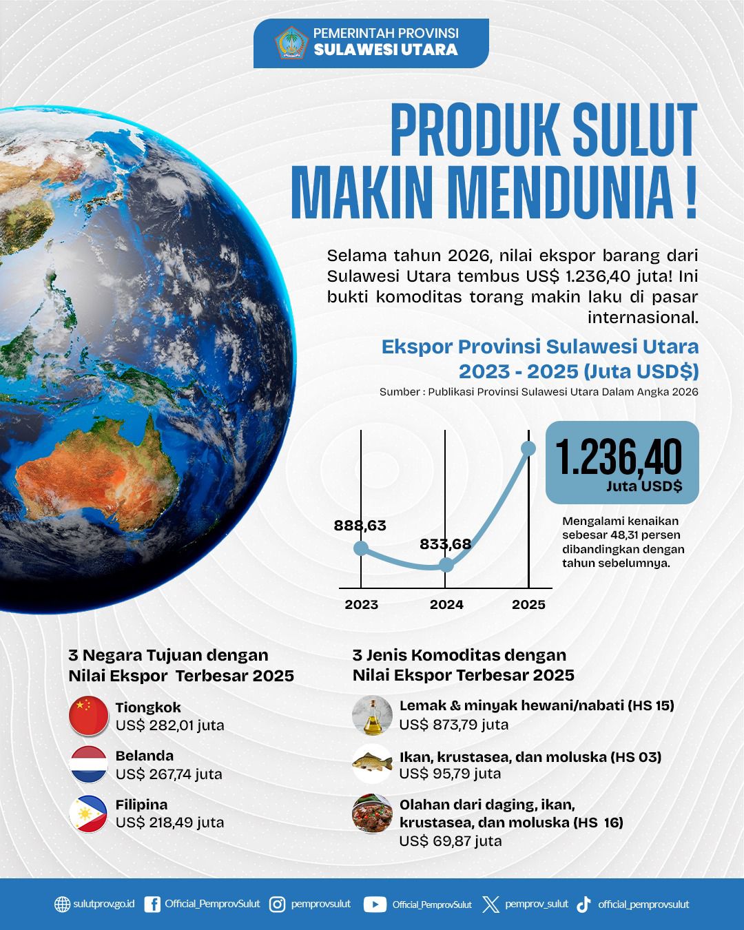Di pasar internasional, produk-produk asal Sulawesi Utara semakin kompetitif. Nilai ekspor barang dari Sulut sepanjang tahun 2025 sukses menembus angka US$ 1.236,40 juta, mengalami kenaikan sebesar 48,31% dibandingkan tahun sebelumnya.